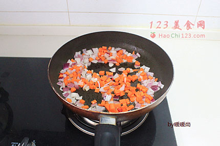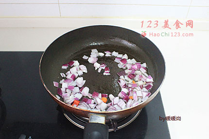 3、平底锅内放适量的花生油,油热后下洋葱炒出香味。