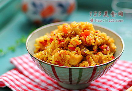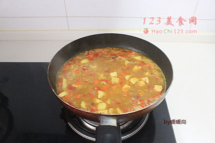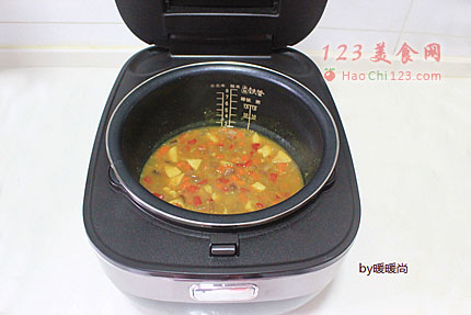 8、将煮好的咖喱汁放入电饭煲内胆中,加入1.5杯的大米,拌匀。接通电源,选择灶烧饭功能,等电饭煲发出滴滴提示声后即可盛出食用。