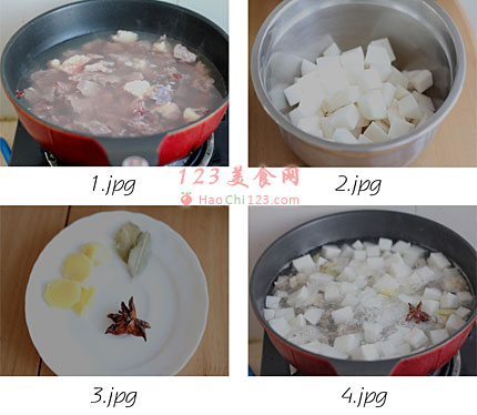 4、焯过水的牛肉和萝卜加上材料3,一起放入锅中,加足量开水。