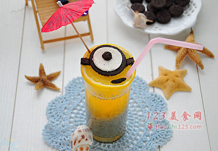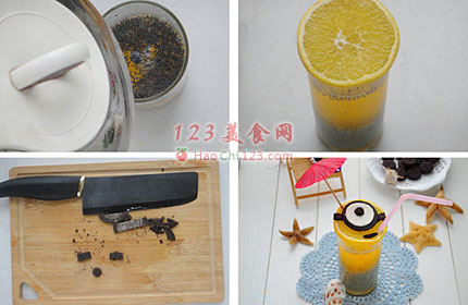 8、带白色夹心的放在橙子上做眼睛,放上眼珠和两边的带子,放上嘴巴。