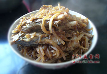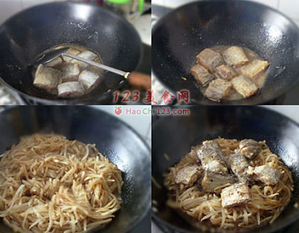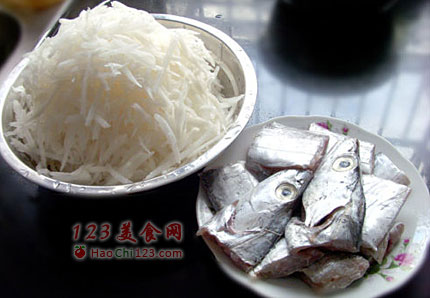 3、起油锅放入萝卜丝炒,焖上3-4分钟,等萝卜丝软了,放入带鱼,轻轻翻炒。