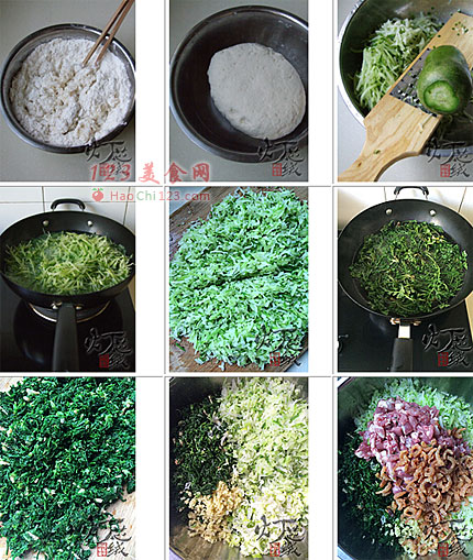 8、萝卜丝和荠菜混合,添加姜末和葱碎。