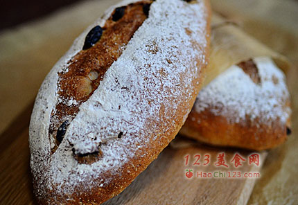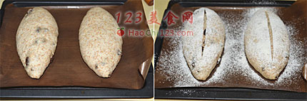 14、在面团表面喷水雾,筛上高筋面粉后,用锋利的小刀在中间划一刀。