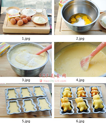 5、小熊模具内壁抹上薄薄一层黄油,将单号胡倒入模具内8分满。