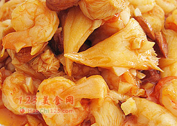 2、热锅中倒入适量橄榄油,放入蒜末,随即把准备好的虾仁放入锅中快速翻炒并放入适量番茄酱。