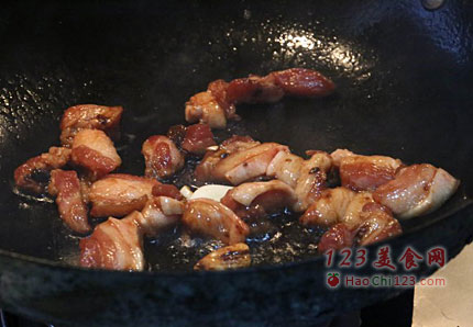 2、用蒜头爆过,先加入比较肥的猪肉榨点油。
