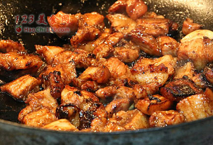 3、然后把所有的肉倒入锅里爆,报到感觉五花肉的油都逐渐的渗出来了,原本顽固的脂肪都慢慢的走出来,和酱汁合二为一,而五花肉里的肉也变得香松酥了。