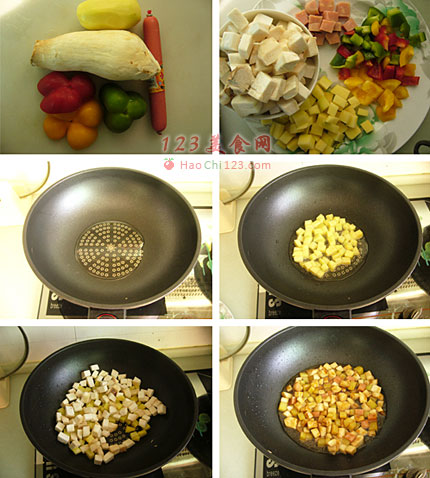 2、锅内放适量油,下土豆丁煎至微黄。