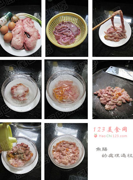 2、鱼肠虽然美味,但清洗的过程绝对不能马虎,鱼肠一定要翻开或剪开,并且一定要用盐和生粉反复冲洗,直至把肠内的污垢清洗干净才可煮用。
