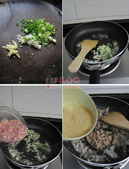 12、爆炒至熟后,加入打散的蛋液,中小火煎至两面金黄即可。