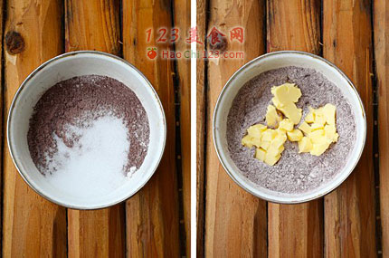 2、加入切成小丁的黄油,用手抓成团。