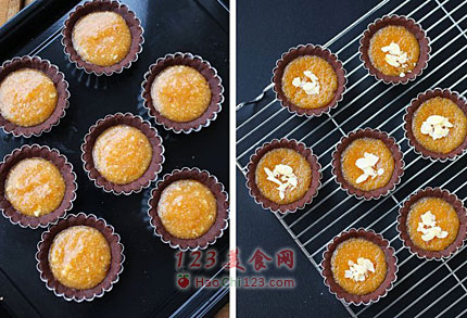 7、烤好的挞皮移去豆子,填好馅料,撒上杏仁片。