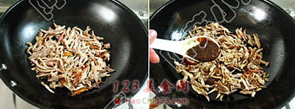 5、再加入甜面酱2-3大勺,翻炒均匀。