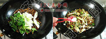 6、加入葱段和香菜段翻炒至软,最后加入适量盐和香油,炒匀出锅。