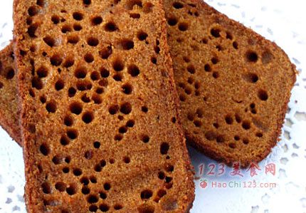 2、蜂巢蛋糕实际上分为两层。烤好的蛋糕,上层是松软的蛋糕结构,而下层就是密密麻麻的“蜂巢”了。所以一般我们会沿中间靠下的位置把蛋糕横切开来,展现出内部的“蜂巢”。