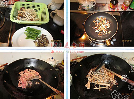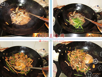 5、锅内留底油,放入蒜片、姜片爆出香味,再加入茶树菇煸炒至茶树菇变软至熟,放入青椒丝、炒好的猪肉条和核桃,调入适量的生抽、蚝油、豆豉香辣酱和盐翻炒均匀即可。