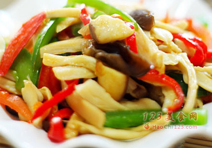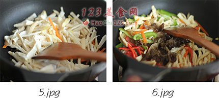 6、大火翻炒到水分收干,倒入青红椒丝,黑木耳丝,炒至断生加鸡精调味即可。