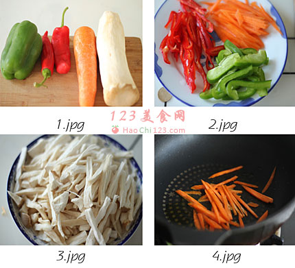 2、青红椒,胡萝卜丝,黑木耳切丝(漏拍啦,临入锅的时候看见妈妈泡的黑木耳就切了些放里面了)。