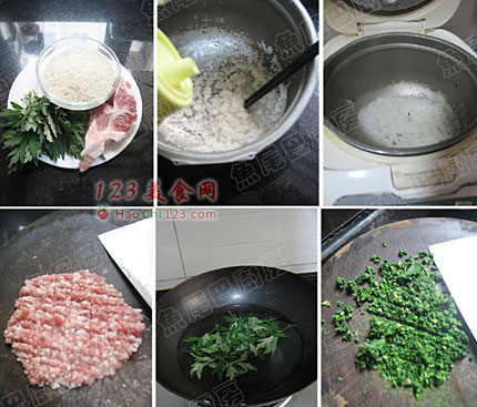 10、把炒好的猪肉艾叶碎加入煮好的米饭中。