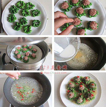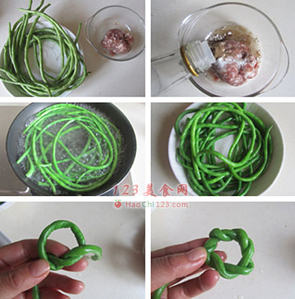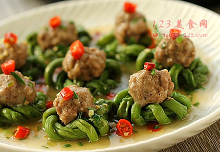 8、再将搓好的小肉丸放在豆角结中间。