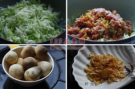 6、锅入橄榄油,放入肉糜、葫芦丝、碎虾皮、草菇碎、蒜米碎、盐拌匀。