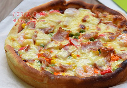 6、将完成最后发酵的披萨面团上面涂上披萨酱,撒上马苏里拉奶酪丝,铺上蔬菜粒,再放上蟹柳、鲜虾和培根片,披萨面上撒上厚厚的马苏里拉奶酪丝。