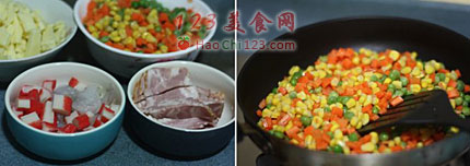 2、面团发酵时,制作馅料,培根片切小块,鲜虾剥壳,用料酒、盐和白胡椒粉腌制,蟹柳切段,而蔬菜粒放入烧热油的平底锅爆炒一下,放入少许盐,沥掉水分待用。
