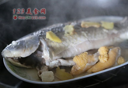 2、蒸熟了以后,把蒸鱼剩下的水倒掉(这个步骤千万不能省略,先前家里请过阿姨,她做的时候有几次忘记把这水倒掉,结果蒸出来的鱼非常、非常、非常的腥。而且会冲淡了酱油的浓度,会不好吃)。