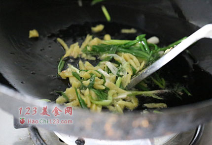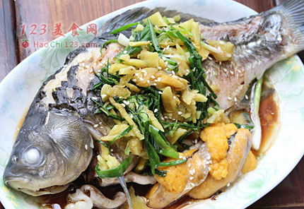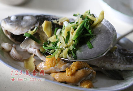 4、将爆好的姜丝和葱花及油都淋在鱼身上(这和粤菜中蒸鱼的方法有点不一样,因为粤菜中的做法是把姜丝和葱花放在鱼身上,然后烧滚油淋在上面把姜丝和葱花淋熟,老前辈们说这样做出来的鱼才够滑,当然,用那么多油泡着鱼当然滑,但确实很油,而且变相要放很多很多酱油才能够味。所以一般家常的时候我会用油爆姜丝葱花就好了,这样做,油用量不会很多,吃起来很健康)。