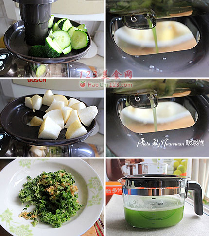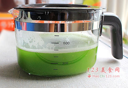 8、将食材档位调制中等,接通电源,开始榨汁。因为在进料桶里还残留着一些榨至半碎的黄瓜,所以出来的雪梨汁还是有一点点绿色。