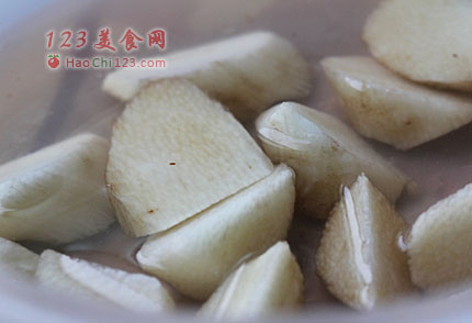 3、山药去皮洗净,切滚刀块用水泡着,否则一不小心就会变色,好难看的。
