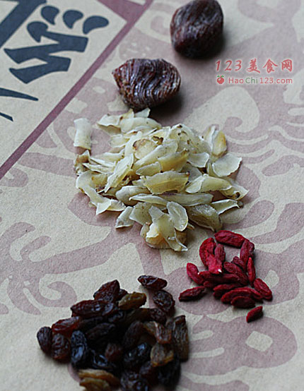 4、蜜枣、枸杞和提子干洗净待用。