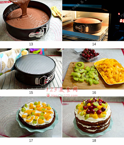 17、淡奶油加适量糖打至9分发,将蛋糕坯分成3份,在每一层中间末适量奶油,再放上水果粒。
