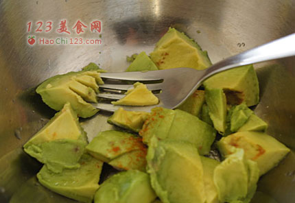 3、加入少许红辣椒粉,蒜粉和洋葱粉,现磨海盐和黑胡椒,挤入半个青柠的果汁,用叉子将材料压成泥,混合均匀。