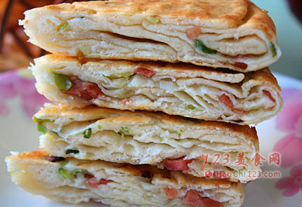 6、擀好的面饼放事先预热好的电饼铛。三分钟后翻面,在过一个三分钟,就OK了。