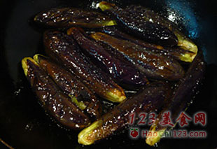 2、炒锅中倒油烧热,放入茄子,用小火慢慢地煎软,盛出。