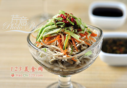10、或将绿豆面条与少许鸡丝、胡萝卜丝和黄瓜丝一同夹起,蘸和风蘸汁送入口中,是谓和风蘸汁绿豆面。