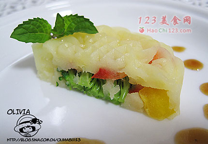 7、在土豆泥中间放入适量西兰花和红黄彩椒丁做内馅。