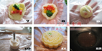 11、用月饼模把土豆蔬菜球压出月饼的形状即可。