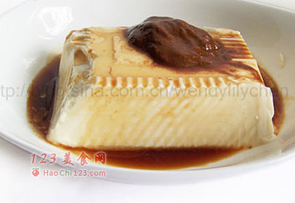 3、芝麻酱、生抽、香油放在豆腐上,吃时拌匀就可以了。