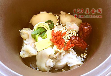 5、把汆烫好的猪蹄放入电炖锅中,加入葱、姜片、红枣、薏米、枸杞,大火烧开,烹入料酒,转小火,加盐,再煮40分钟,撒上香菜末即可。