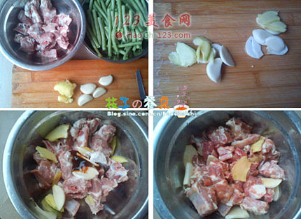 2、长豆角摘小断,洗净沥干待用。姜蒜切片。
