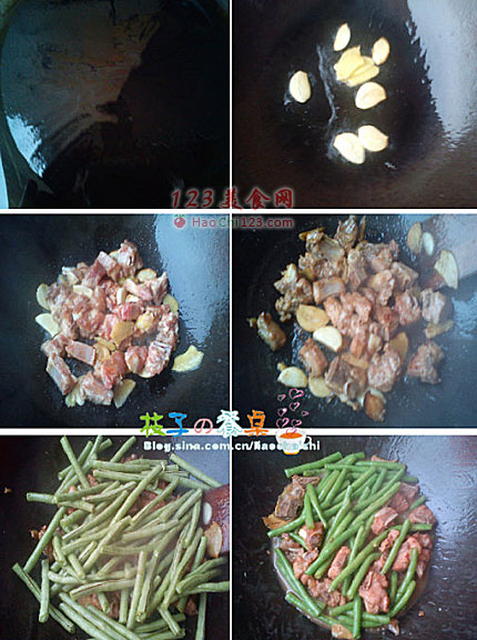 3、热锅上油,放入姜蒜片煸香,然后加入沥干好的排骨块进行煸炒,煸至排骨两面微黄,排骨里的油也煸出来时,再加入洗好的豆角进行翻炒,豆角需要油干炒才好吃,而且没油会很容易炒糊,正好排骨里煸出来油这下正好综合了。