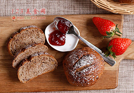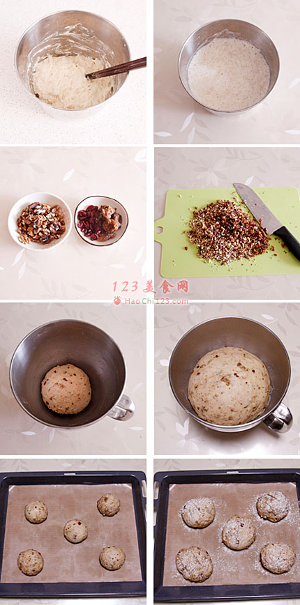 2、将B原料除黄油外加入到面浆中,揉至出筋膜加入黄油揉至完全扩展,加入切碎的果干,慢速将果干揉进面团里即可。