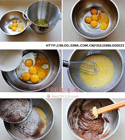 2、可可面糊非常容易消泡,所以我这5个小个鸡蛋也只做了4个四寸的可可蛋糕,若是普通面糊,估计能做出4-5个小蛋糕来。[sushi.laoyanhuo.com]