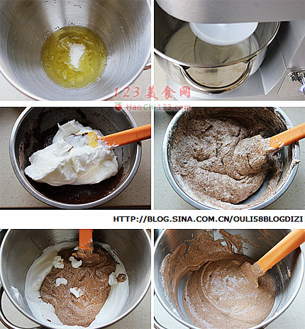 2、可可粉和低筋面粉过筛后,分两次加入蛋液中,每次加入都要切拌均匀至粉类无颗粒状。