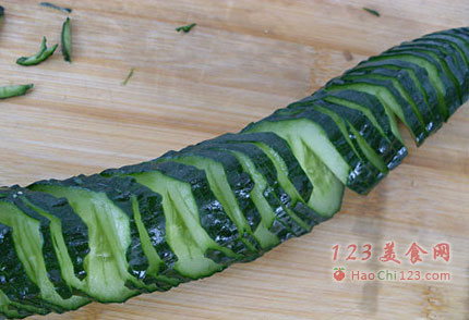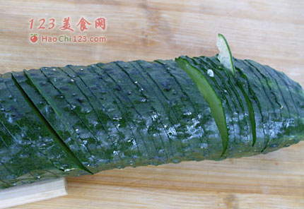 2、先直刀切,黄瓜片切的越薄越好,因为下面有筷子垫着,不用担心切断。