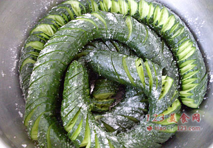 4、黄瓜片切的越薄黄瓜就能拉的越长,将黄瓜都切完以后放到盆里,洒上适量的盐腌制大概两个小时,黄瓜出水以后倒掉多余的水分。