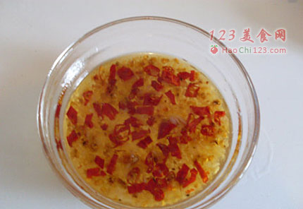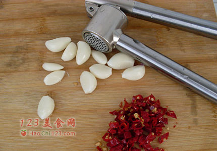 5、将蒜用压蒜器压成蒜末,切的也可以,辣椒切成小段。