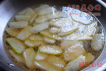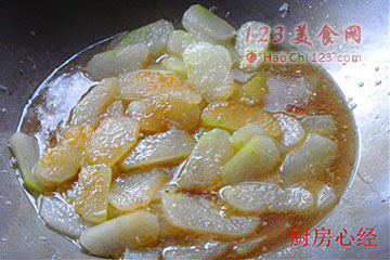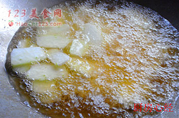 4、冬瓜片入4成热的油锅,稍炸即可捞出。